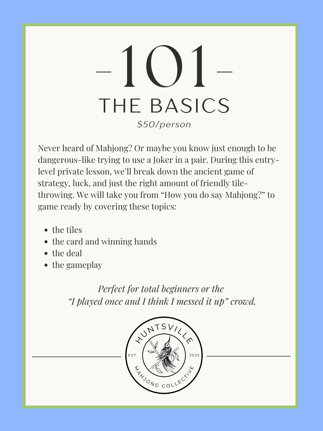 Thank you for stopping by!Whether you came here out of curiosity, a love for mahjong, or because a friend said, “You have to check this out!” — we’re glad you’re here. Huntsville Mahjong Collective is more than just a game; it’s laughter around the table, shared snacks, and stories you’ll tell long after the tiles are packed away.We can’t wait to play, teach, and connect with you.