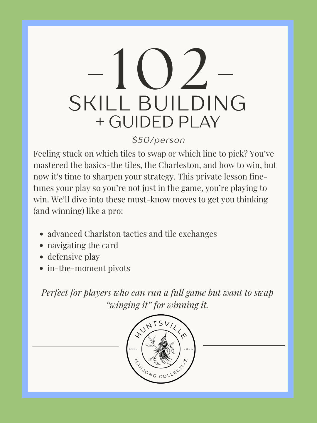 Sure, you can learn mahjong anywhere — but with us, you’ll have fun doing it.We’re not just mahjong enthusiasts; we’re experienced educators who’ve spent years teaching and coaching adults. That means we know how to meet you where you are, break things down clearly, and adapt our teaching on the fly (we call it instructional agility). Whether you’re a quick study, a “let’s go over that one more time” learner, or somewhere in between, we’ve got you covered.Our sessions are equal parts strategy, story, and snack time. Expect laughter, lighthearted competition, and just enough wit to keep you on your toes. Prefer a calm, rules-first vibe? We can do that. Want a spicier, “winner-takes-all” table energy? We’ve got that too.At the end of the day, we believe mahjong is more than tiles and rules — it’s about creating a space where you feel welcome, connected, and excited to come back. And if there’s a plate of cookies or a charcuterie board in the middle of the table… well, we think that makes it even better.